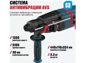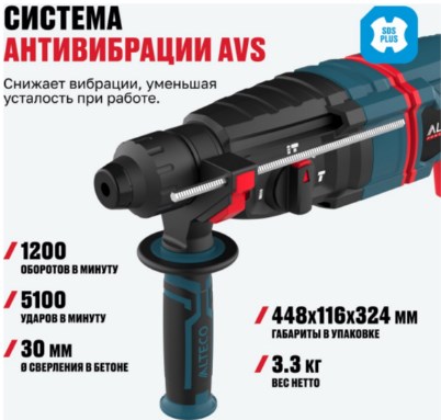 Перфоратор ALTECO RH 950-30 AVS SDS-Plus — мощный инструмент для профессионалов и домашних мастеров, обеспечивающий высокую производительность и надёжность в работе. С максимальной энергией удара в 3.3 Дж и частотой ударов до 5100 ударов в минуту, он справится с любыми задачами по сверлению и долблению.