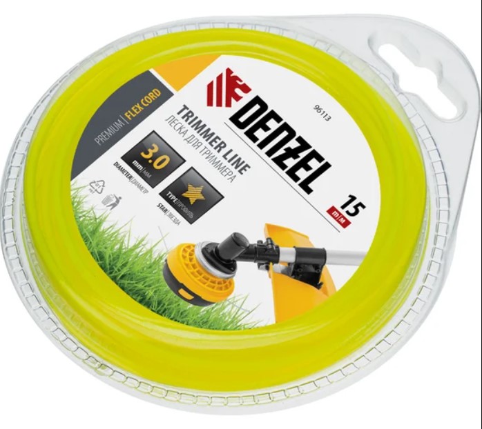 Леска Denzel FLEX CORD 96113 с сечением «звезда», диаметром 3 мм и длиной 15 м, поставляется в блистере и используется для бензиновых триммеров. Предназначена для стрижки жесткой, высокой и густой травы, а также борьбы с сорняками с толстыми стеблями, бурьяном и лопухами.