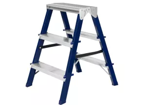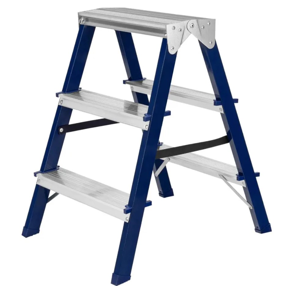 Стремянка Сибртех двусторонняя, 3 ступени стальная — прочная и устойчивая модель, предназначенная для выполнения различных бытовых и ремонтных работ. Конструкция полностью выполнена из долговечной стали, что обеспечивает высокую прочность, надёжность и устойчивость при эксплуатации. Двустороннее исполнение позволяет использовать стремянку с обеих сторон, повышая удобство и эффективность работы. Широкие рифлёные ступени (80 мм) изготовлены из стали и предотвращают скольжение, обеспечивая безопасность пользователя. Изделие выдерживает нагрузку до 150 кг и имеет высоту до площадки 0,65 м. Стремянка не оснащена телескопическим механизмом, отличается стабильностью, долговечностью и подходит для использования дома, на даче или в мастерской.