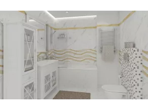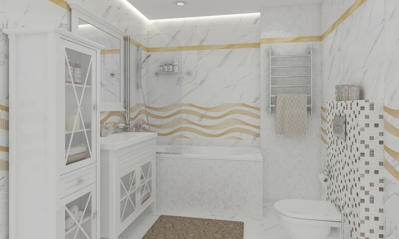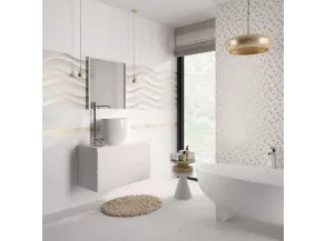 Ретифицированная керамическая плитка Vivienne Alma Ceramica произведена в России на обновленных в 2018 году поточных линиях ПАО «Завод керамических изделий», который больше известен нам как Уралкерамика. Современное оборудование позволило предприятию выпустить кафель европейского образца под новым брендом «Alma Ceramica», который дополняет собой уже знакомую нам торговую марку производителя — керамику «М-Квадрат». Базовая настенная плитка Vivienne от Alma Ceramica представлена гладким модулем с рисунком «под мрамор» и двумя рельефными модулями-компаньонами. Белоснежный кафель с имитацией каррарского камня прекрасно смотрится на фоне «мраморного» слэба с объемными волнами по полю, а также вкупе с текстурным модулем, который будто частично покрыт мраморными чипами мозаики. Тему волн продолжат декоры, покрытые золотой глазурью, а также бордюры формата 6,7х74 см. Привлечет внимание и декор, выполненный как мрамор c золотыми прожилками, - это настоящая роскошь в квадрате. Не обойдется в коллекции и без классическо