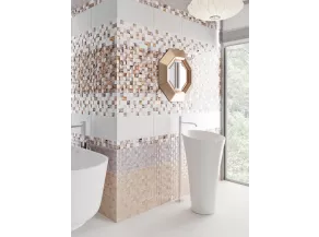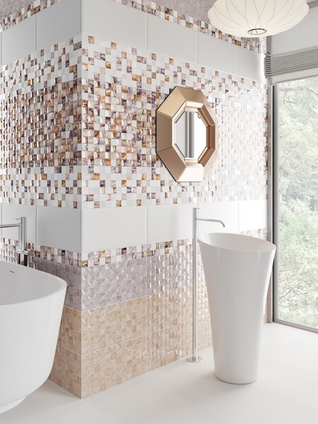 Керамическая плитка Asti Уралкерамика изготовлена в России. Вся керамика здесь имеет рельефную фактуру с эффектом 3D. Каждый модуль поделен на квадраты, которые возвышаются над плоскостью утеля неправильными пирамидами с ломаными верхушками. Дополнительно некоторые элементы проработаны волнистыми и косыми линиями, изменяющими преломление света на глянцевой глазури, отчего бликов и блеска становится больше.