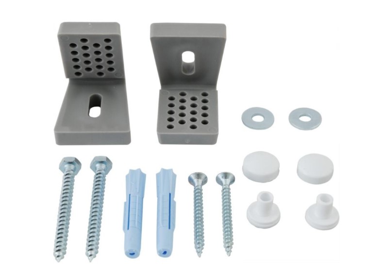 Состав комплекта: 2 фиксирующих скобы, 2 дюбеля 8x61, 2 шурупа 6x60, 2 шурупа 5x50, 2 шайбы М6, 2 шайбы-втулки, 2 белых защитных вставки, 2 декоративных колпачка белого цвета для маскировки крепежа.