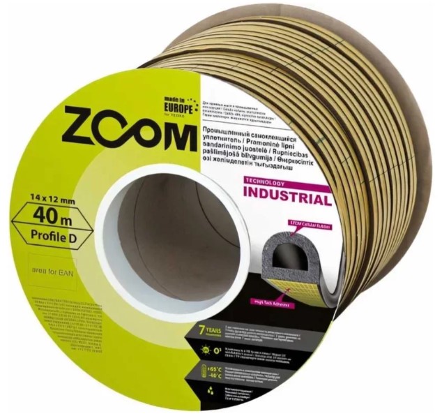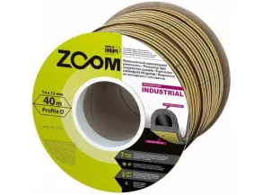 Уплотнитель ZOOM Industrial имеет D-профиль, ширину 14 мм, толщину 12 мм, в бобине 40 метров. Подходит для щелей размером от 3 до 13 мм.