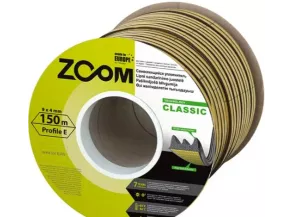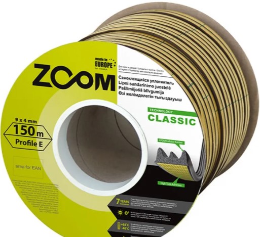 Уплотнитель ZOOM Classic имеет Е-профиль, ширину 9 мм, толщину 4 мм, в бобине 150 метров. Подходит для щелей размером от 2 до 3,5 мм.