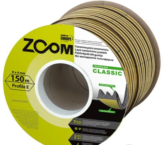 Уплотнитель ZOOM Classic имеет Е-профиль, ширину 9 мм, толщину 4 мм, в бобине 150 метров. Подходит для щелей размером от 2 до 3,5 мм.
