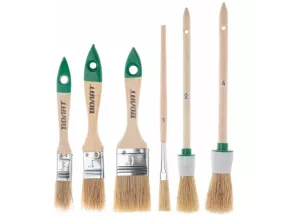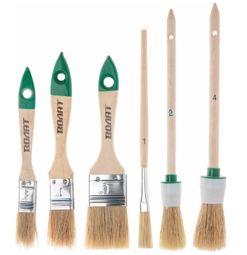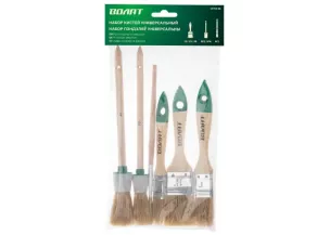 Набор кистей ВОЛАТ 6 предметов 10704-06 предназначен для малярных работ, нанесения лаков и масляных красок. Натуральная светлая щетина одинарной выварки устойчива к сильным растворителям, обладает хорошей краскоотдачей, обеспечивая равномерное распределение краски по окрашиваемой поверхности. Эргономичная деревянная рукоять обеспечивает комфортную эксплуатацию. Металлический бандаж с антикоррозийным покрытием отличается надежностью и долговечностью.