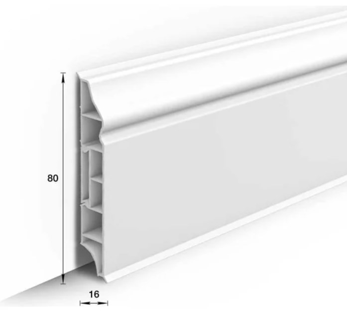 Плинтус напольный Идеал Дюра 80 мм 001 Белый, 2,2 м, фигурный – стильный и практичный элемент для аккуратного завершения интерьера. Благодаря изящному фигурному профилю плинтус мягко подчеркивает переход от стены к полу и добавляет помещению декоративной выразительности. Универсальный белый цвет легко сочетается с любыми покрытиями и оттенками, делая его подходящим для классических и современных интерьеров. Плинтус выполнен из качественного ПВХ, устойчивого к влаге, ударам и солнечному свету. Встроенный кабель-канал позволяет скрывать провода, сохраняя эстетику и порядок в комнате. Установка проста и удобна, особенно с фирменными комплектующими.
