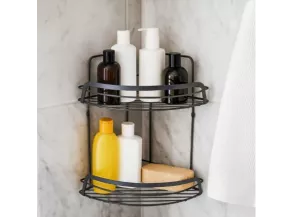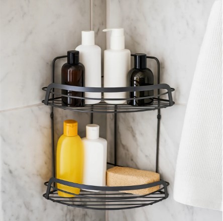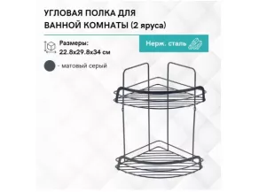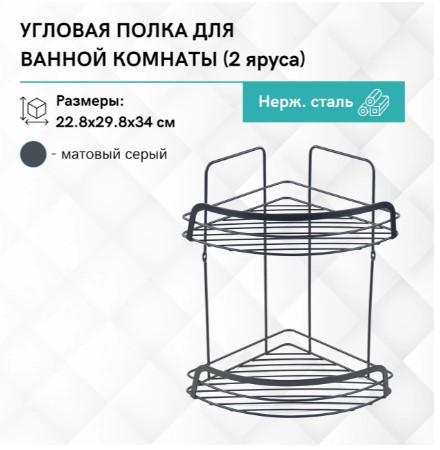 Полка имеет двухъярусную конструкцию, что позволяет эффективно использовать угловое пространство в ванной комнате. Она обеспечивает достаточное место для хранения различных косметических и гигиенических средств, таких как шампуни, гели для душа, мыло и прочие аксессуары, поддерживая порядок и чистоту.