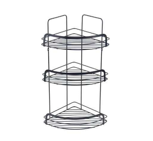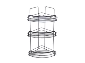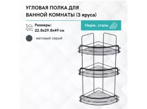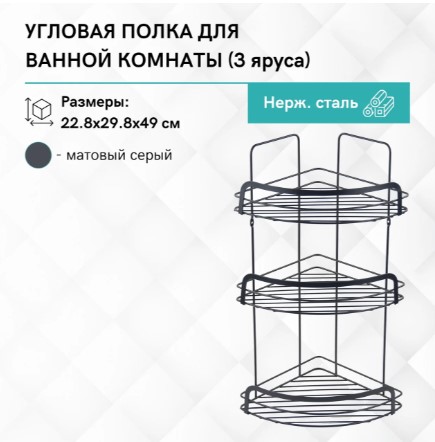 Полка имеет трехъярусную конструкцию, что позволяет эффективно использовать угловое пространство в ванной комнате. Она обеспечивает достаточное место для хранения различных косметических и гигиенических средств, таких как шампуни, гели для душа, мыло и прочие аксессуары, поддерживая порядок и чистоту.