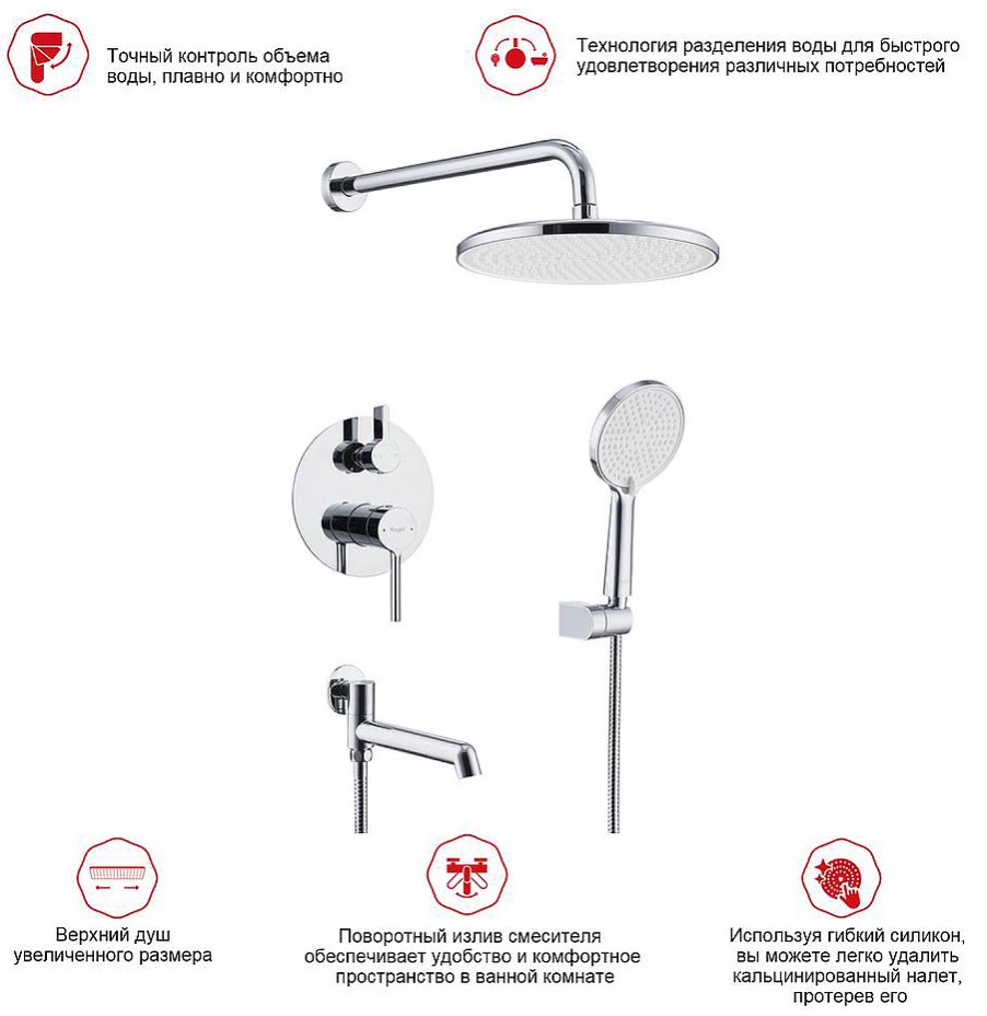 Душевая система Raglo R20.27 (хром) — стильная и функциональная встраиваемая система для ванной. Верхний тропический душ диаметром 250?мм создаёт мягкий и равномерный поток воды, а ручная лейка с тремя режимами струи позволяет выбрать комфортный вариант для ежедневного душа. Поворотный излив и керамический картридж 35?мм обеспечивают точное и лёгкое управление температурой и напором воды. Душевой шланг длиной 1,5?м и держатель лейки добавляют удобства, а монтаж системы встраиваемый, что скрывает коммуникации и делает интерьер ванной аккуратным. Корпус из латуни с хромированным покрытием долговечен и устойчив к коррозии.