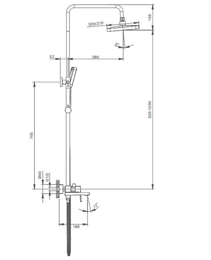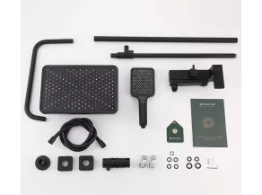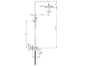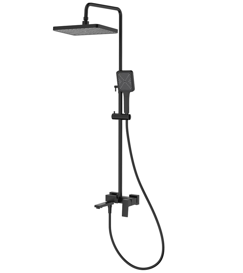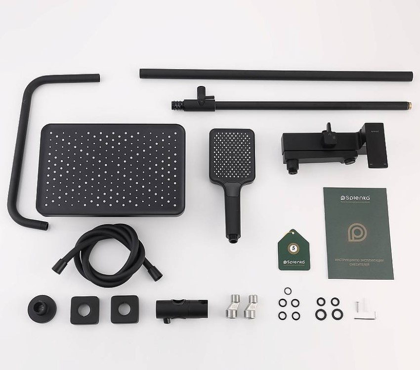В комплект поставки входят верхний душ, душевая штанга с держателем лейки, ручной душ, смеситель и шланг.