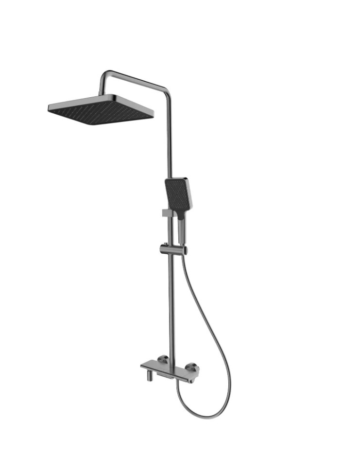 Душевая система Splenka S54.24.09 (оружейная сталь) — современный и стильный гарнитур для ванной комнаты. Корпус выполнен из латуни с покрытием «оружейная сталь», которое придаёт интерьеру строгий и элегантный вид, а также защищает металл от коррозии и царапин. Система оснащена верхним тропическим душем 250 мм, ручной лейкой с тремя режимами струи и поворотным изливом для удобного наполнения ванны.