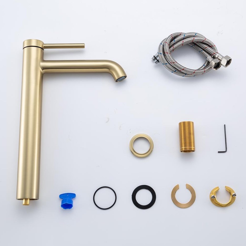 Высокий смеситель для раковины от бренда Gappo, модель G1006-23 — стильное и функциональное решение для ванной комнаты. Корпус выполнен из качественной латуни, что обеспечивает надёжность и долговечность. Покрытие «сатин-золото» придаёт смесителю благородный и современный вид, а матовая поверхность более устойчива к отпечаткам и царапинам, чем глянцевые варианты. Однорычажное управление с керамическим картриджем даёт точную регулировку температуры и напора воды.