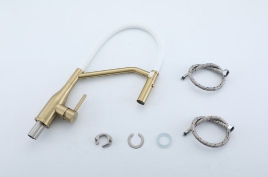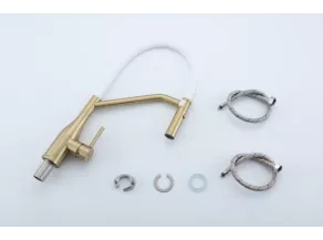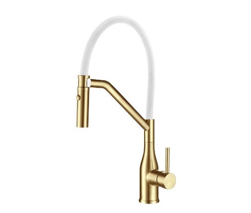 Gappo G4098-13 (золотой сатин). Он изготовлен из латуни с покрытием цвета «золотой сатин», рассчитан на монтаж на одно отверстие, и управляется одним рычагом. Подключается стандартно ?? с гибкой подводкой. Картридж керамический диаметром 35 мм. Излив поворотный, длина излива составляет около 23,4 см, общая высота изделия примерно 50,9 см.