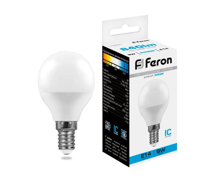 - 25803 Лампочка светодиодная Feron 9W 230V E14 6400K G45 LB-550