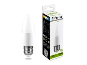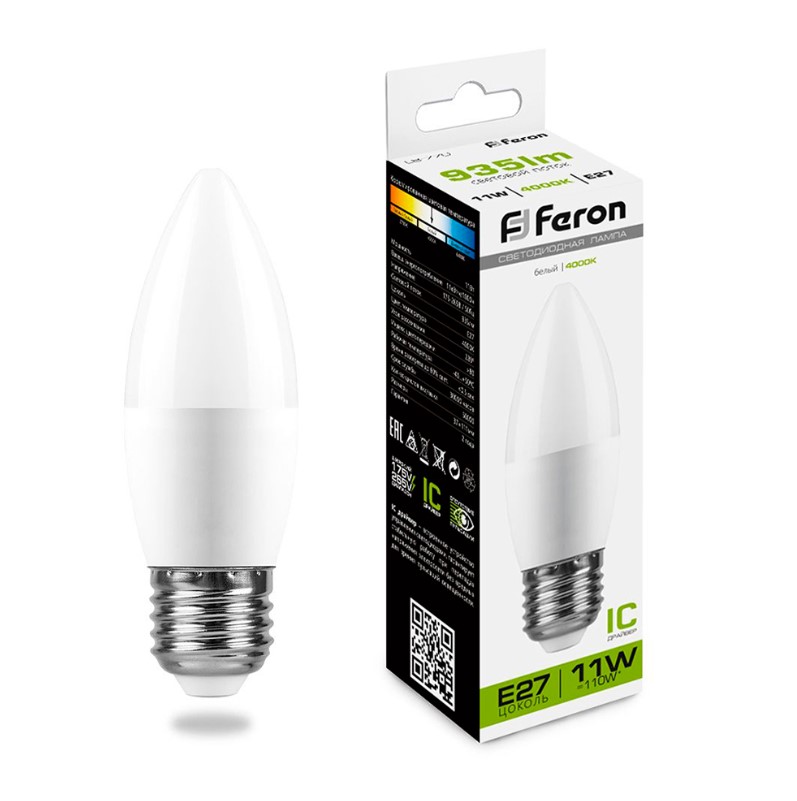 Лампа светодиодная FERON LB-770, C37 (свеча), 11W 175-265V E27 4000К (белый), рассеиватель матовый белый, 935Lm, угол рассеивания 220°, корпус пластик, 107*37мм