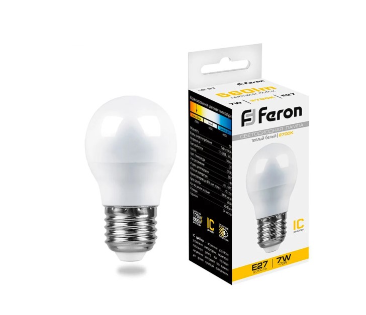 - Лампочка светодиодная Feron 7W 230V E27 2700K G45 LB-95